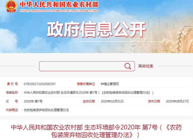 第五条县级以上地方人民政府农业农村主管部门负责本行政区域内农药生产者、经营者、使用者履行农药包装废弃物回收处理义务的监督管理。
